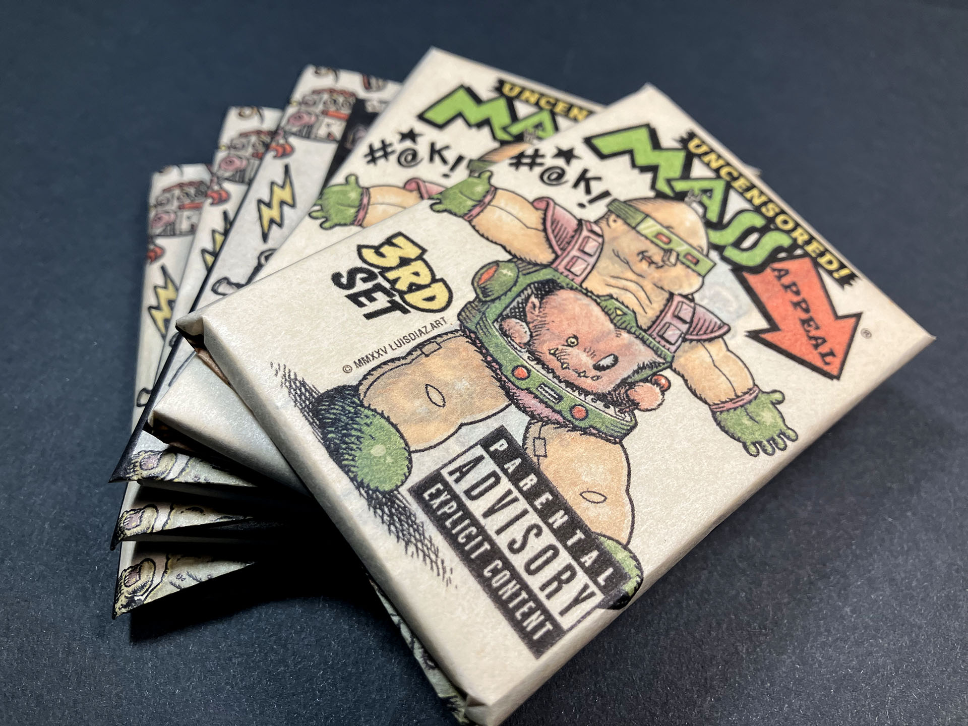 *This is the Third Set of cards for the 2025 Art of Luis Diaz Parody Series “Mass Appeal™.” You will receive UNCENSORED! cards in each Pack which may also include regular cards. These UNCENSORED! packs contain a separate parallel set with its own unique colored wrapper. They have the same ratio of sketchcard hits, but includes cards that are pushing the line of Black Humor and may be appreciated by a more mature audience.
