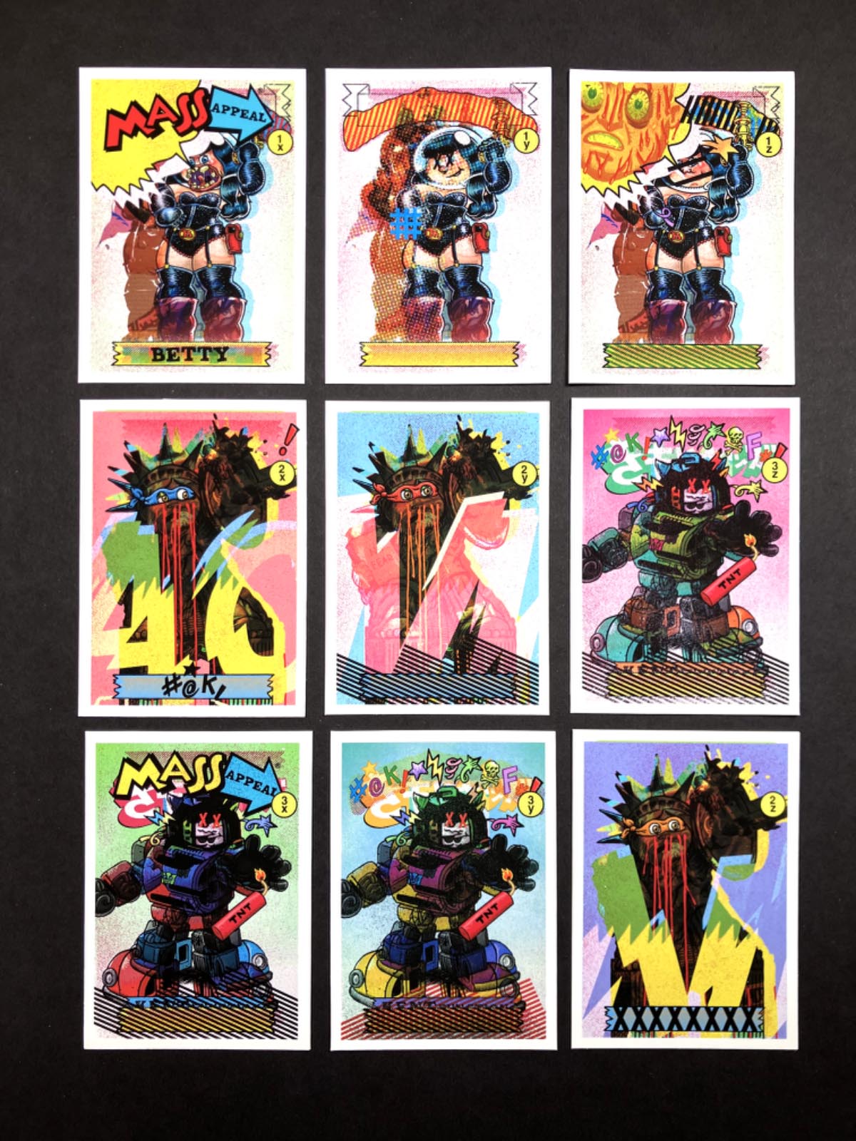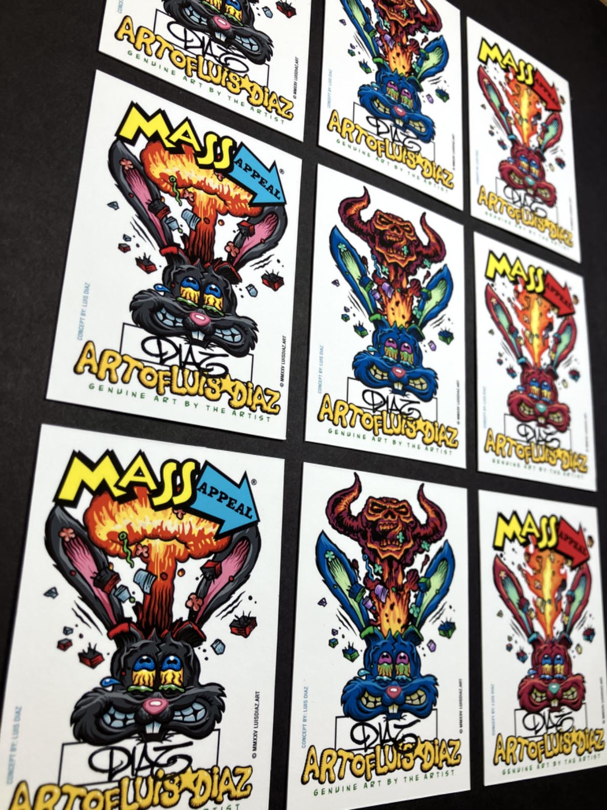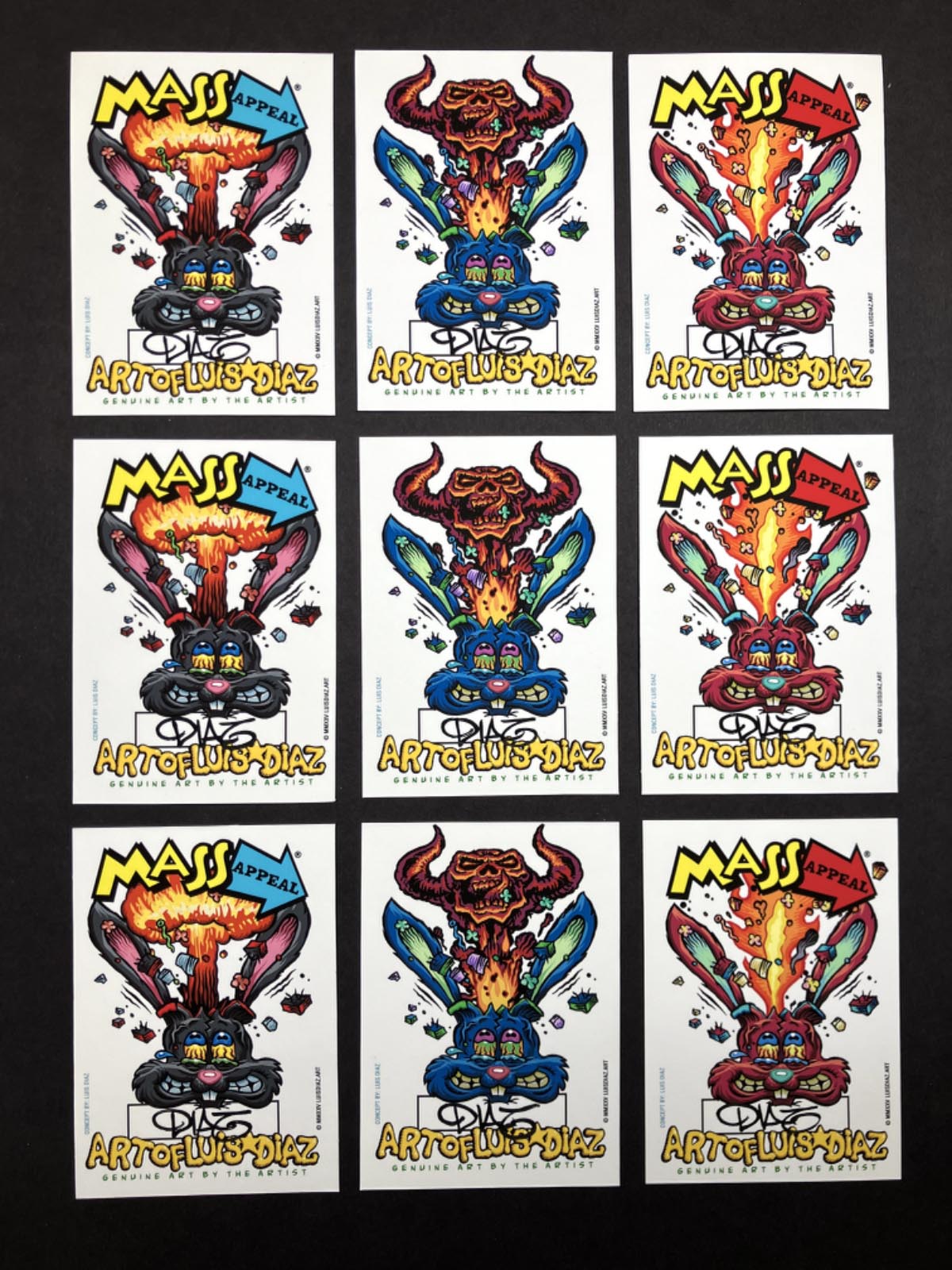 These card sets are inspired by the misprint mishaps that happen in the process of making trading cards. Each new set will contain a new theme. Luis Diaz is known for his previous Garbage Pail Kids paintings from 2003-2010 and other entertainment brands. Diaz has made a reputation for creating unique original illustrations inspired by his love of cartooning and beautifully design products.