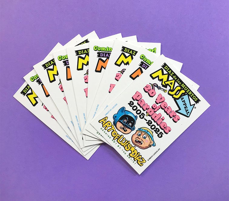 Each new set will contain a new theme. Luis Diaz is known for his work as an illustrator and for his previous Parody paintings including Garbage Pail Kids & Wacky Packages (2003-2010) and other entertainment brands. Diaz has made a reputation for creating unique original illustrations inspired by his love of cartooning and beautifully design products. This year marks 20 years (since 2005) of making creator-owned Parodies!
