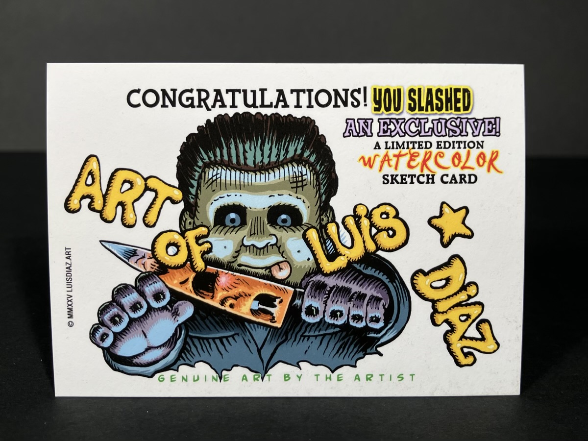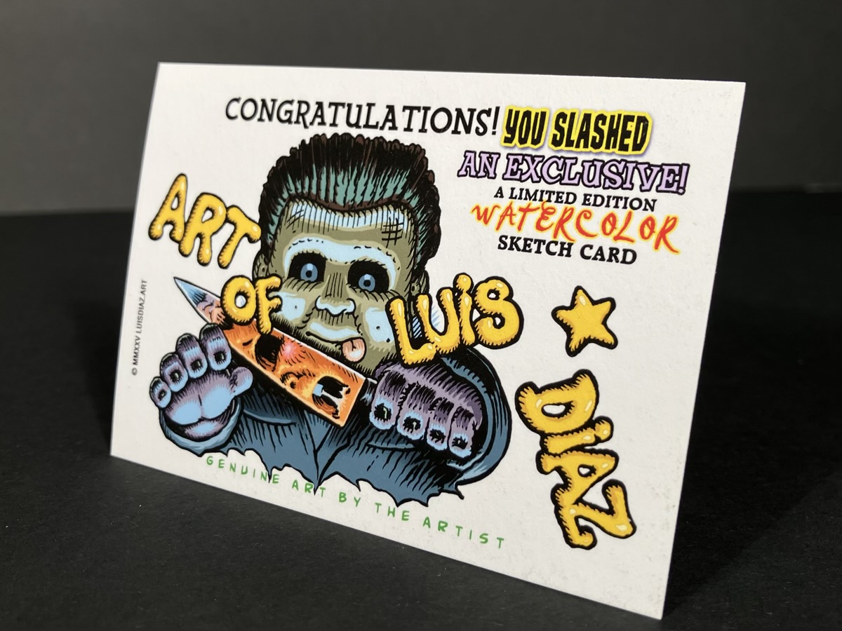 Hand painted sketch card by Parody Artist Luis Diaz with fine art watercolor. Each one is numbered and you will get one numbered from 1-25. Image is a sample image of one of the 25 sketch cards. Some might have alternative color choices, but usually consistent to the image pictured.