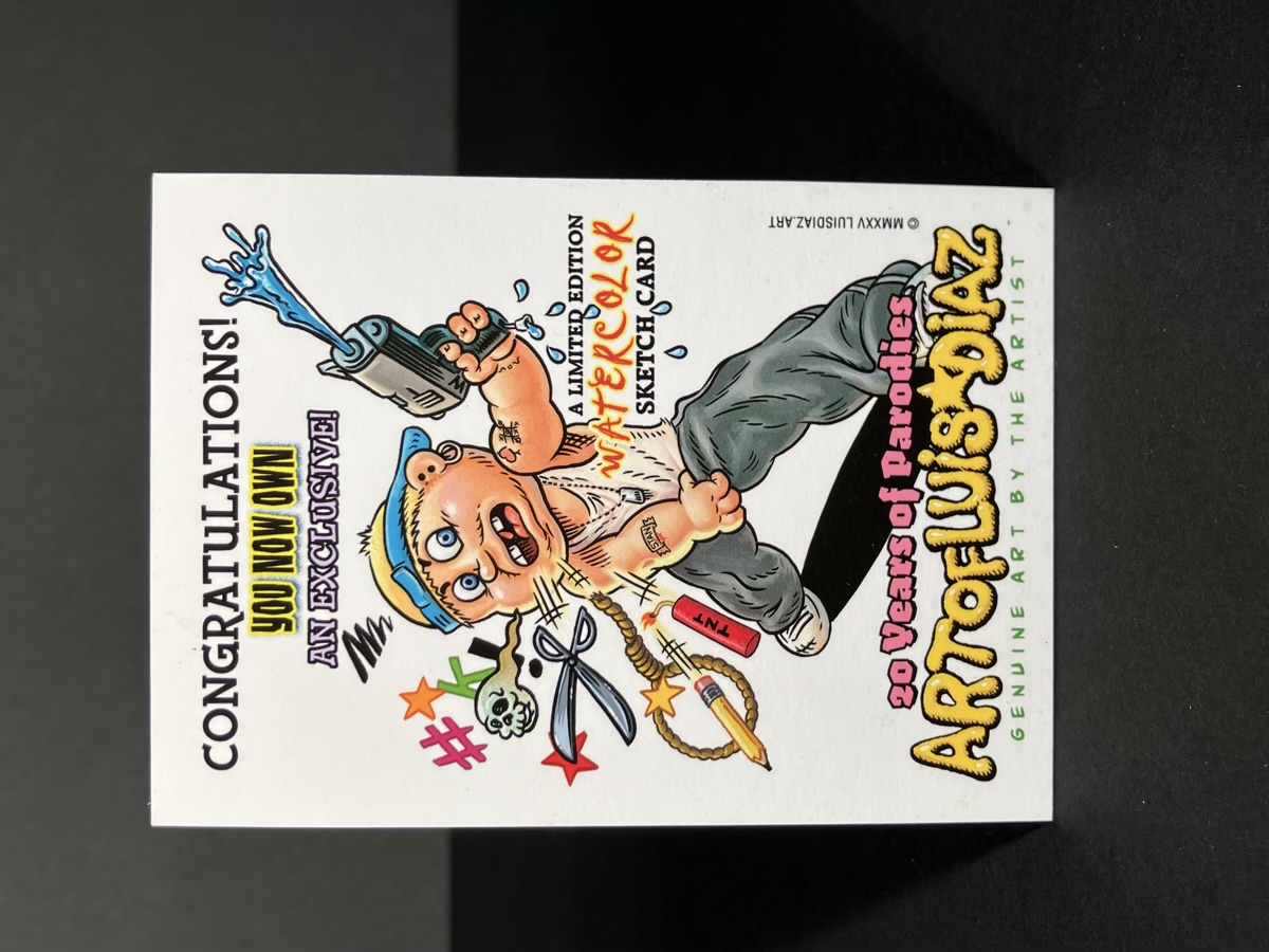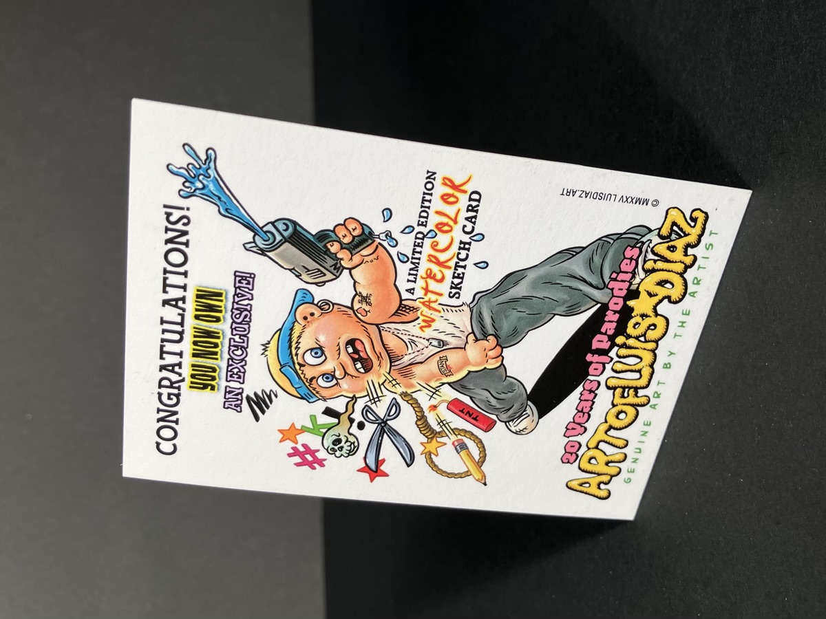 Hand painted sketch card by Parody Artist Luis Diaz with fine art watercolor. Each one is numbered and you will get one numbered from 1-25. Image is a sample image of one of the 25 sketch cards. Some might have alternative color choices, but usually consistent to the image pictured.