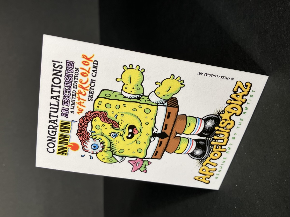 Hand painted sketch card by Parody Artist Luis Diaz with fine art watercolor. Each one is numbered and you will get one numbered from 1-25. Image is a sample image of one of the 25 sketch cards. Some might have alternative color choices, but usually consistent to the image pictured.